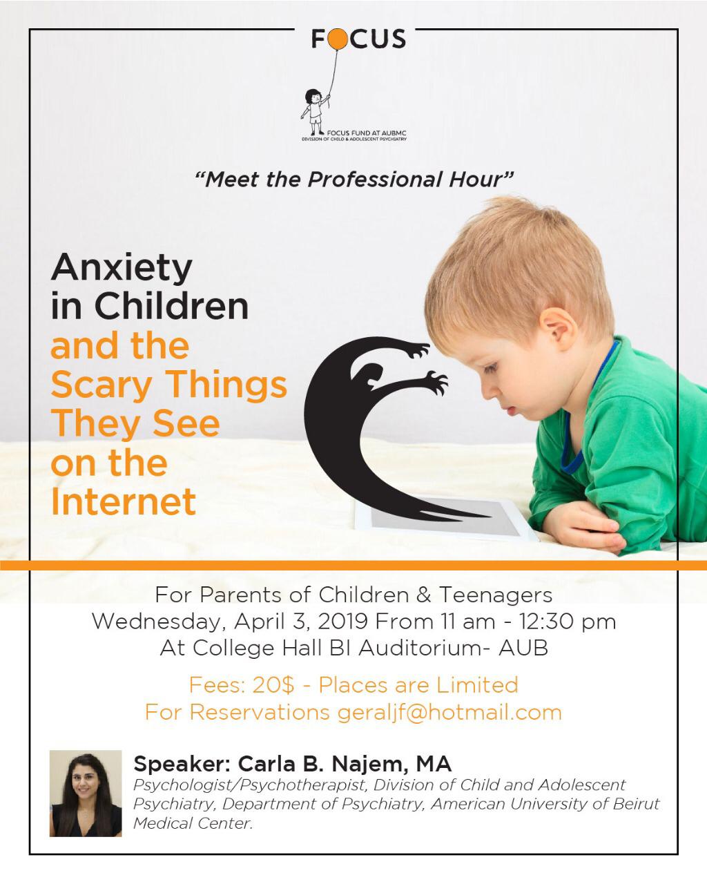 Our next Meet the Professional Hour is about Anxiety in Children and the Scary Things They See on the Internet. Join us with Ms. Carla B. Najem, MA, Psychologist / Psychotherapist, to learn more, on Wednesday, 3rd of April, 2019 from 11am till 12:30, at College Hall B1 Auditorium -AUB.